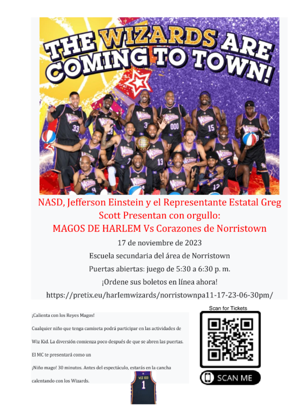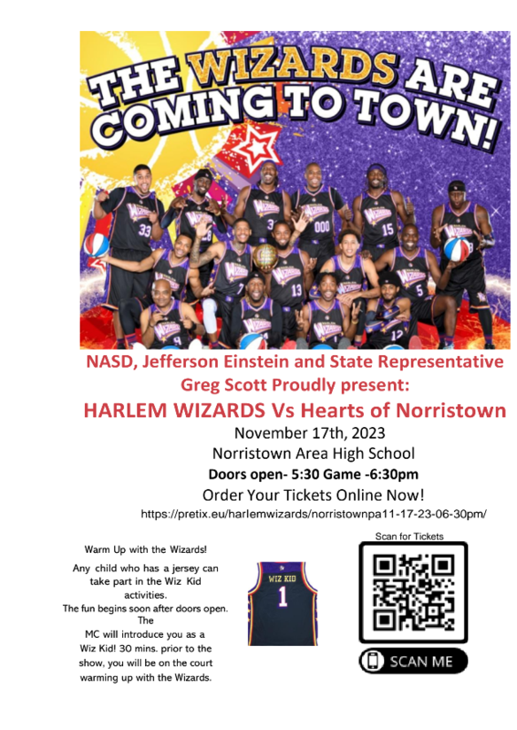 In partnership with Jefferson Einstein and State Representative Greg Scott, Norristown Area School District is pleased to welcome back the Harlem Wizards on Friday, November 17, 2023. We are happy to bring this event back to our community for the first time since before the COVID pandemic. Attached is information about the game and ticket information. We welcome you to attend and bring your family for a fun night out!